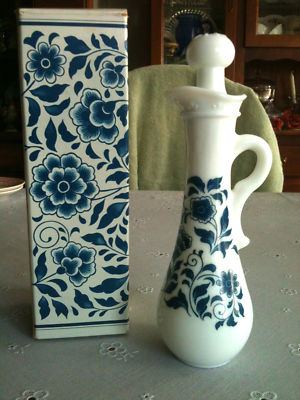 Avon Sonnet Foaming Bath Oil Decanter with box. Blue floral design white bottle.