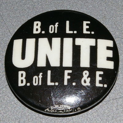 Brotherhood of Locomotive Engineers & B. of L. F. & E. Unite campaign button