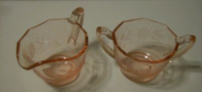 Title (ebay affiliate link): VINTAGE Etched Glass Depression Pink Creamer & Sugar Bowl Unknown Pattern