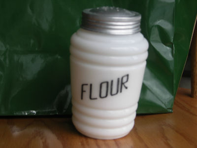 White glass depression era flour shaker, 4 1/2 " tall, great shape