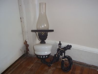 antique iron and milk glass light fixture mounts on wall