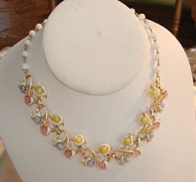 Title (ebay affiliate link): VINTAGE CORO YELLOW -BLUE-PINK CAB NECKLACE MILK GLASS ENDS