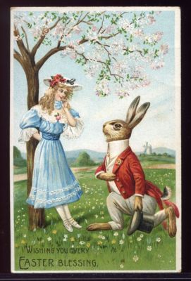 Title (ebay affiliate link): Postcard Easter Dressed Rabbit Red Jacket Top Hat Victorian Girl Fantasy