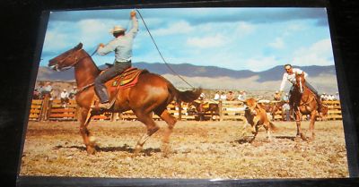 Title (ebay affiliate link): 2 Cowboys On Horses Roping Calf (Cow) Vintage Rodeo Postcard Mid 1900s Life