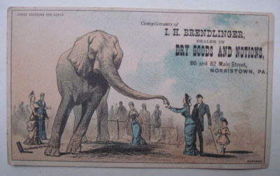 Title (ebay affiliate link): 1900s I.H. Brendlinger, Dry Goods, Norristown PA Victorian Trade Card elephant