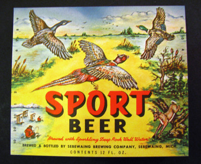 189 old SPORT BEER bottle labels pheasants, game animals, hunting, ice fishing