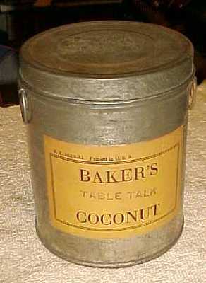 Title (ebay affiliate link): 1930's VINTAGE SHABBY BAKER'S TABLE TALK COCONUT TIN CONTAINER