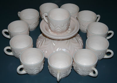Title (ebay affiliate link): Vintage Jeannette Feather Shell Pink Punch Bowl Stand & 12 Milk Glass Cups Old