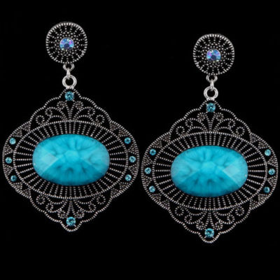 women charms tibet silver rhinestone cz blue resin flower dangle antique earring