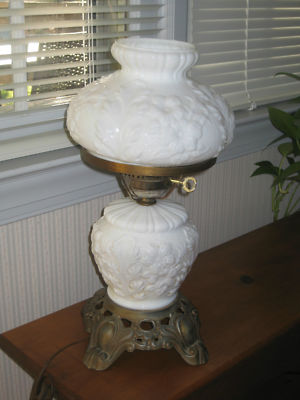 Title (ebay affiliate link): Vintage/Antique Milk Glass Electric Table Lamp with flowers