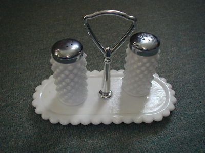 Title (ebay affiliate link): VINTAGE FENTON MILK GLASS HOBNAIL SALT & PEPPER SHAKERS, TRAY WITH METAL HANDLE