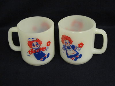 2 RAGGEDY ANN & ANDY WHITE MILK GLASS MUGS