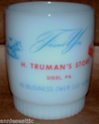 RARE fire King milk glass mug TRUMANS Store Sigel PA anchor hocking Jefferson