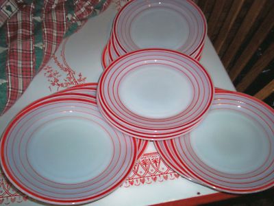14 Vintage Red Striped Opaque Milk Glass Dinner Lunch Plates restaurant? Retro