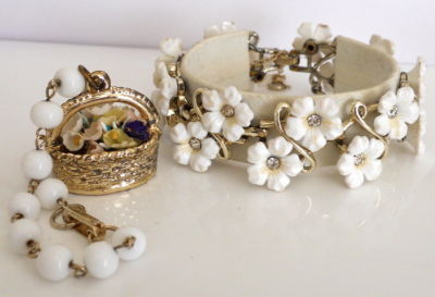 2Pc Vintage Bracelet Lot CORO White Apple Blossom, Flower Basket Milk Glass Fob