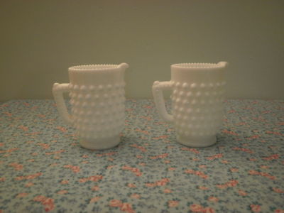 2 Fenton Milkglass Hobnail 3" Tall Mini Pitchers.