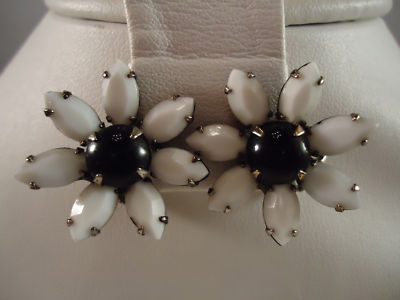 Title (ebay affiliate link): Vintage Prong Set Milk Glass & Black Cabochon Flower Clip Earrings
