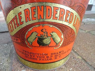 PERFECTION BRAND KETTLE RENDERED LARD TIN- GLENS FALLS NEW YORK -PIG IMAGE