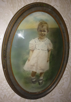 PICTURE OF TODDLER IN AN ANTIQUE WOODEN OVAL FRAME W/CONVEX BUBBLE GLASS