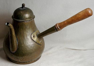 Title (ebay affiliate link): ANTIQUE HAND HAMMERED BRASS/TIN LINED DOVETAILED TEAPOT-WOOD HANDLE