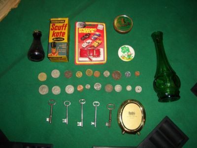 Junk Drawer estate lot keys depression glass vase brass picture frame coins car