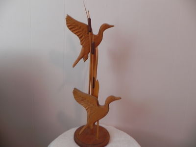 Title (ebay affiliate link): Hand Made of Wood Unique carved 2 ducks in flight in the cat tails Centerpiece