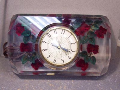 Title (ebay affiliate link): VINTAGE LUCITE/ ACRYLIC ROSE PLUG IN DESK CLOCK, LANSHIRE MOVEMENT MO. T3