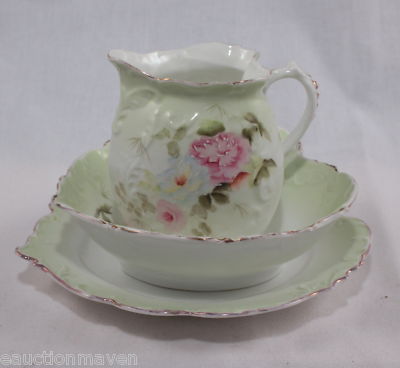 Title (ebay affiliate link): Heart Shaped Hand Painted 3PC Pitcher & Bowl Green Pink Floral Shabby Chic Gold