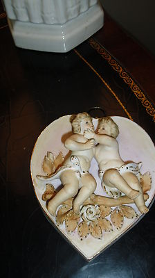High Relief Vintage Porcelain Cherub Plaque, Double Arrows Marked