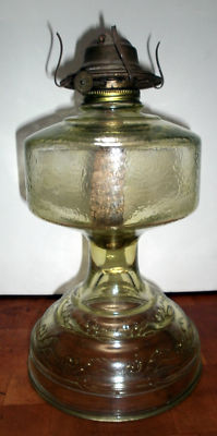 Title (ebay affiliate link): Antique embossed Green Glass Kerosene Lantern footed hurricane lamp oil