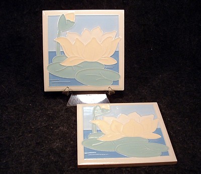 Title (ebay affiliate link): 2 Vintage Mosaic Tile Co. Zanesville Ohio Yellow Water Lily Ceramic Tiles