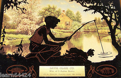 VINTAGE SILHOUETTE DAVIS GLASS COMPTON CA BOY DOG FISHING 6" X 8" OLD ESTATE