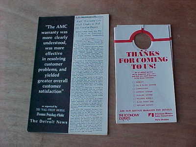 AMERICAN MOTORS 1973 AMC WARRANTY ARTICLE + 1975 DEALER SHOW ROOM HANG TAG MINT!