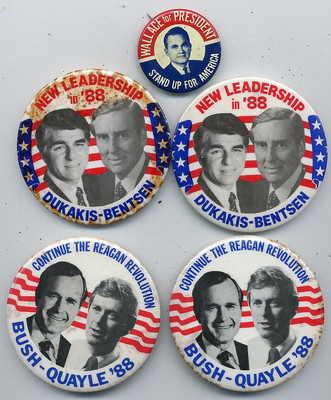 Lot of five large presidential campaign buttons Dakakis, G.W. Bush & Wallace