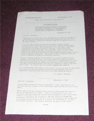 Title (ebay affiliate link): Original JFK White House Document - Historic Steel Dispute - 9/14/61
