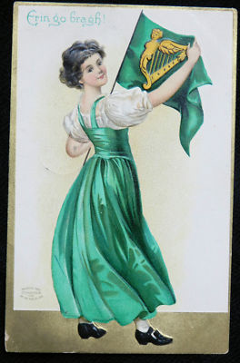 Title (ebay affiliate link): ANTIQUE ST PATRICK'S DAY POSTCARD IRISH GIRL FLAG W/ HARP ERIN GO BRAGH -IA 1908