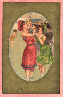 BATHING BEAUTY Postcard BABY Mom SEASHORE Ocean SAILBOAT Gold Embel. POSTCARD