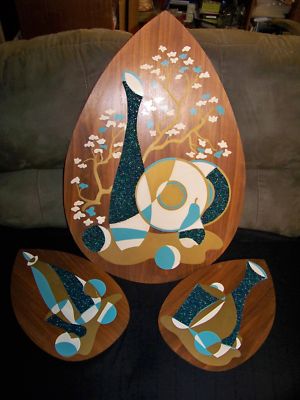 Title (ebay affiliate link): Vintage Eames Era Danish Walnut Textural Set of 3 Mid Century Art Wall Plaques