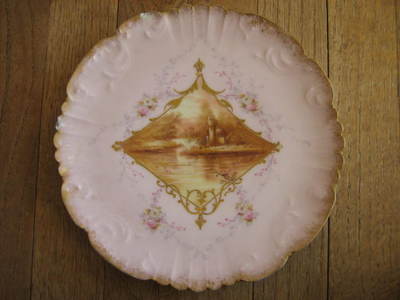 Vintage AK Limoges Plate-Pink Gold Gilt w/ Hand Painted Landscape-River Castle