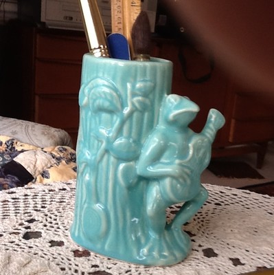 Title (ebay affiliate link): USA marked pottery McCoy? Shawnee? frog with guitar vase turquoise, 6 5/8" tall