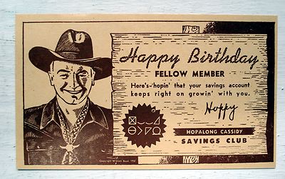Title (ebay affiliate link): HOPALONG CASSIDY "HAPPY BIRTHDAY" POST CARD 1950 - UNUSED