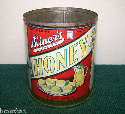 Title (ebay affiliate link): VINTAGE OLD MINER'S PRODUCTS AMBER HONEY FRESNO TIN 1935 YELLOW RED 5 lbs!