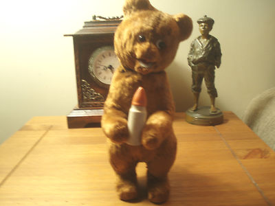 Title (ebay affiliate link): ANTIQUE WIND-UP VELVET DRINKING BEAR WITH BOTTLE & KEY WORKS!