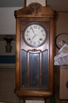 ANTIQUE WOOD CASE WALL CLOCK KEY/PENDULUM FLAG? WORKS