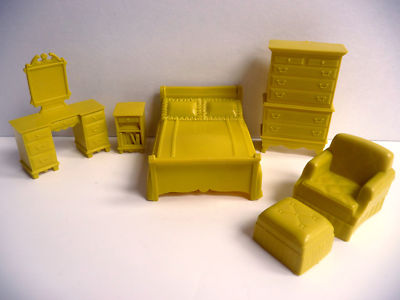 MARX VTG 60s HARD PUCE YELLOW PLASTIC DOLLHOUSE FURNITURE BED HIGHBOY CHAIRS ETC