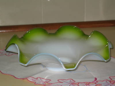 ANTIQUE OPAQUE MILK GLASS FLUTED GREEN FRUIT BOWL NICE!