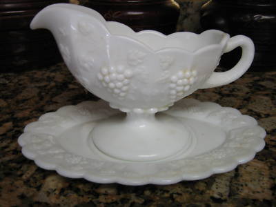 westmoreland milk glass gravy boat and plate grapes