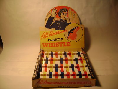 Title (ebay affiliate link): Vintage "All American Plastic Whistles", 1950's with original store display box