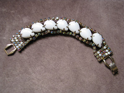 Title (ebay affiliate link): VINTAGE MILK GLASS STONES AND MULTI-RHINESTONES GOLDTONE 7" BRACELET
