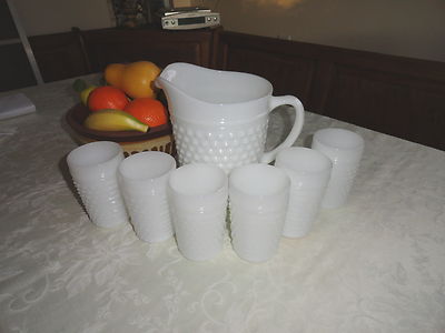 Title (ebay affiliate link): VINTAGE HOBNAIL MILK GLASS PITCHER AND 6 GLASSES WEDDING SHABBY PARTY